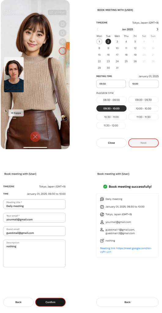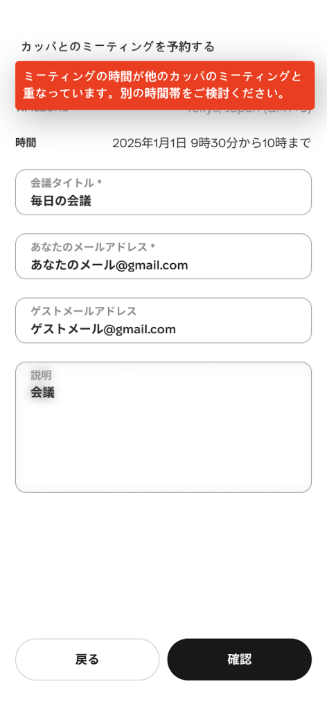 - ミーティングの重複を即時にお知らせ:AIアシスタントが常にスケジュールを管理し、友人や同僚が実際に空いている時間にのみミーティングを予約できるようにします。ミーティングを予約する際、同じ時間帯にすでに予定が入っている場合は、相手にアラートが表示されます。これにより、ミーティングの重複や不要なやり取りを防ぎ、スケジューリングを簡単かつストレスフリーに行えます。