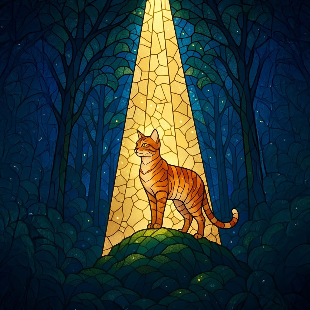 静かな夜の気配が深く感じられる色合いで、幻想的な世界観が特徴的です。深い藍の森に星屑のような光の描写に、猫の身体は内側から灯るような輝きで形づくられています。