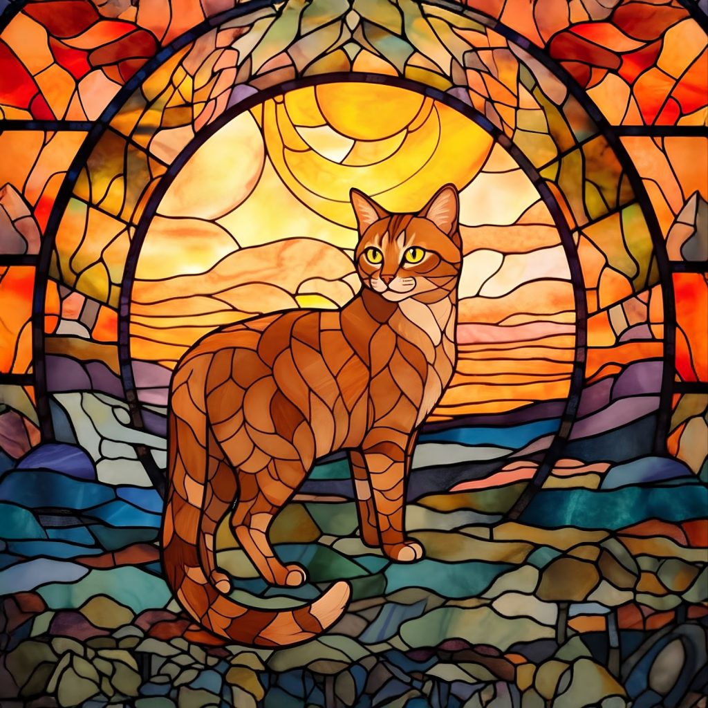夜明けの岬に立つ猫を描いた作品です。水平線から昇る光は海と空をやわらかく染め、静かな潮風の気配が感じられ、それはまるで物事の新たなはじまりを告げているようです。ステンドグラス風の色面が地平の直線を強調し、モチーフに頼らない構図そのものの力を強く感じます。