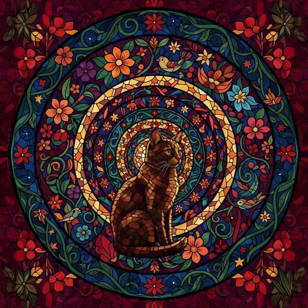色鮮やかな花々と蔦の文様が渦を描く中央に、静かに座す猫を描いた作品です。花の環は季節の循環や生命の連なりを象徴し、環の中に存在する小鳥のモチーフが伝統と神秘を感じさせます。全体として、細密なモザイク表現が華やかさと静謐さを同時に際立たせ、中心の猫が「世界の軸」であり全てを見定めるような神々しさを感じさせる一枚です。