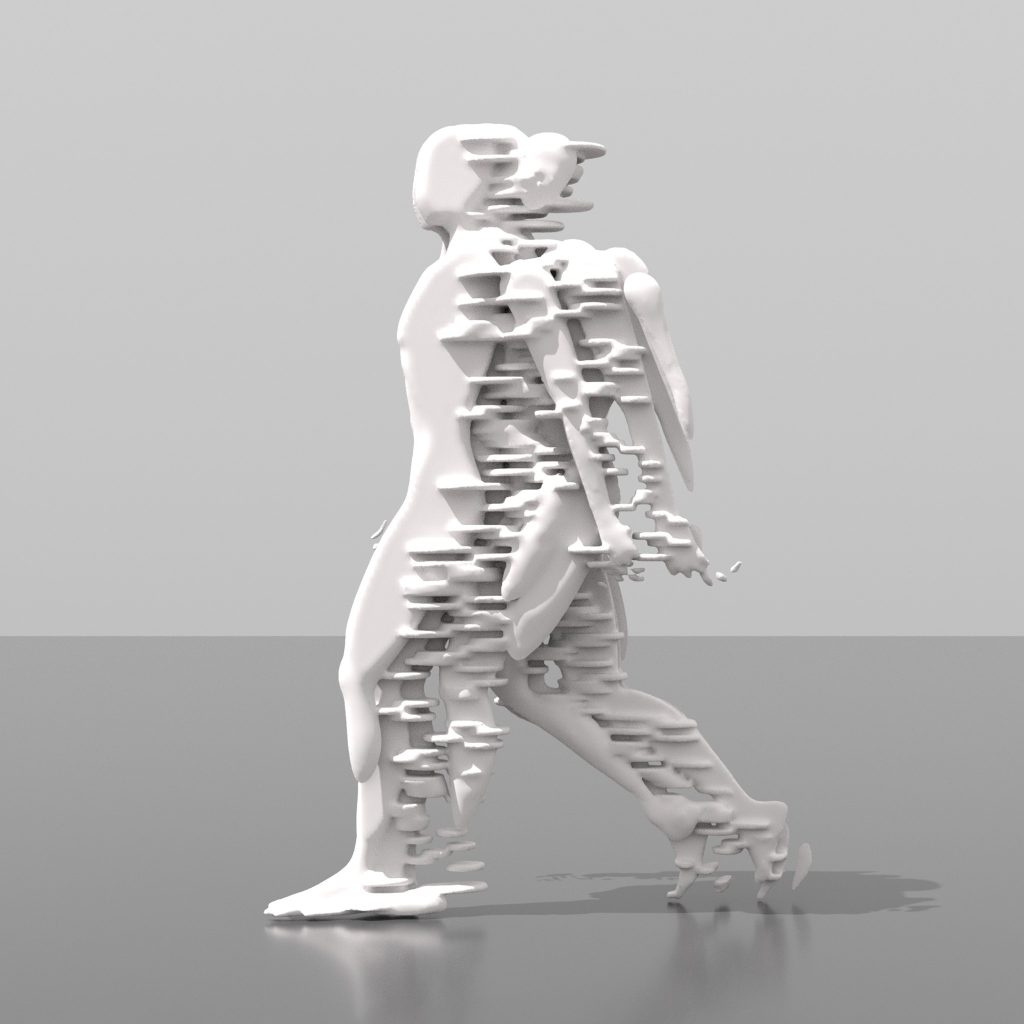 歩行中の人物を縦横にスライスし、形状が辛うじて認識できる解像度で分解することで、「人のフォルムとは何か」ということをテーマとした作品です。