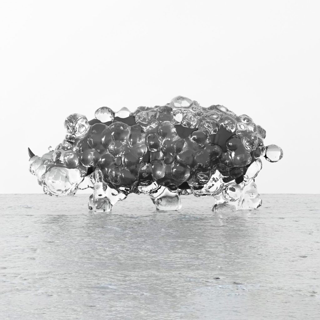 特徴的なフォルムを持つサイの周囲に大量の泡状オブジェクトをまとわせ、その泡によって元の形が削られながらも、角や体の輪郭など“サイらしさ”を確実に残したまま表現した作品です。